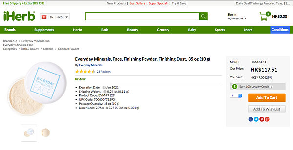 如選擇 Everyday Minerals Finishing Dust,產品頁面會顯示貨品價格、重量、到期日等資料,還有顧客的評分以供參考