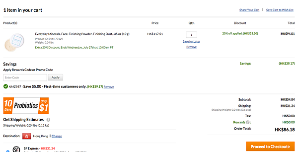 首次購物者,在「Apply Rewards Code or Promo Code」的空格內,輸入「NMZ987」並按「Apply」,即可享首次購物 US5 折扣優惠。而現有客戶也可輸入「NMZ987」,以獲取整張訂單額外 5% 折扣優惠,切勿錯過。