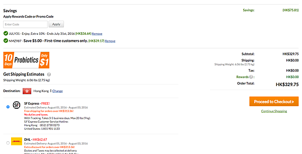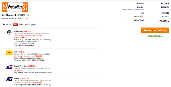 只需購物滿 US40,更可享全單免運費優惠!運送方式有以下幾種,如購物滿 HKD313.36,可免費使用順豐速遞運,將貨物直送到香港,而且不收其他偏遠地區或住宅服務費。