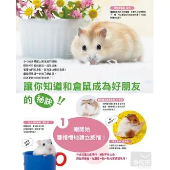 書中的內容都非常實用,不能盡錄,建議有意飼養倉的大小朋友,也可先閱讀這本《倉鼠的快樂飼養法》,考慮一下自己能否提供一舒服的環境給可愛的小倉鼠,以及了解哪一類倉鼠最適合你飼養,才去買鼠鼠和用具。很可惜在香港不容易買到這本書,或許要到博客來訂購呢﹗